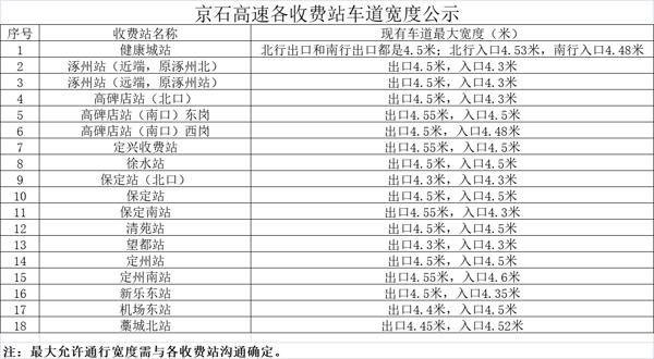 京石高速各收費站車道寬度公示