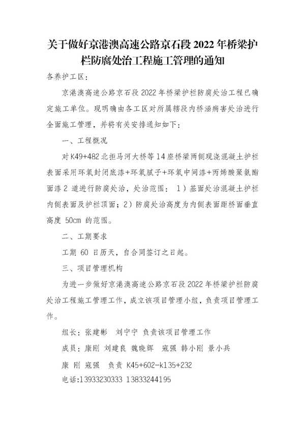 關(guān)于做好京港澳高速公路京石段2022年橋梁護欄防腐處治工程施工管理的通知