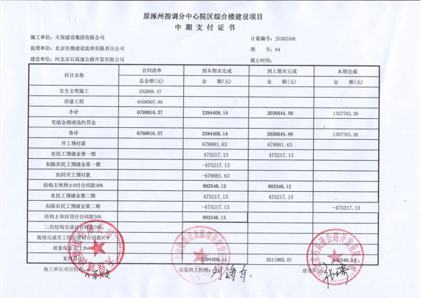 原涿州指調(diào)分中心院區(qū)綜合樓建設(shè)項(xiàng)目第四期中期支付證書