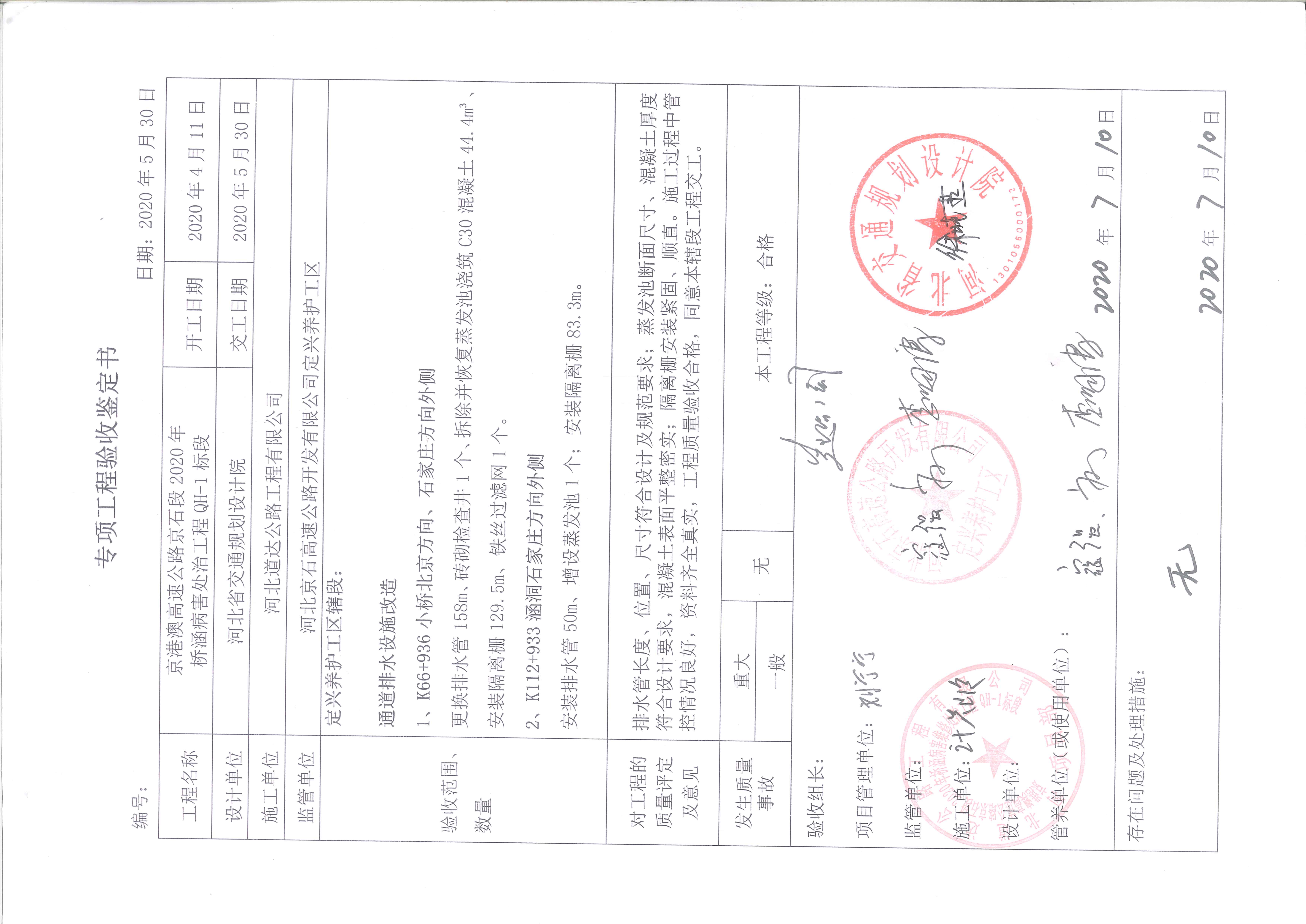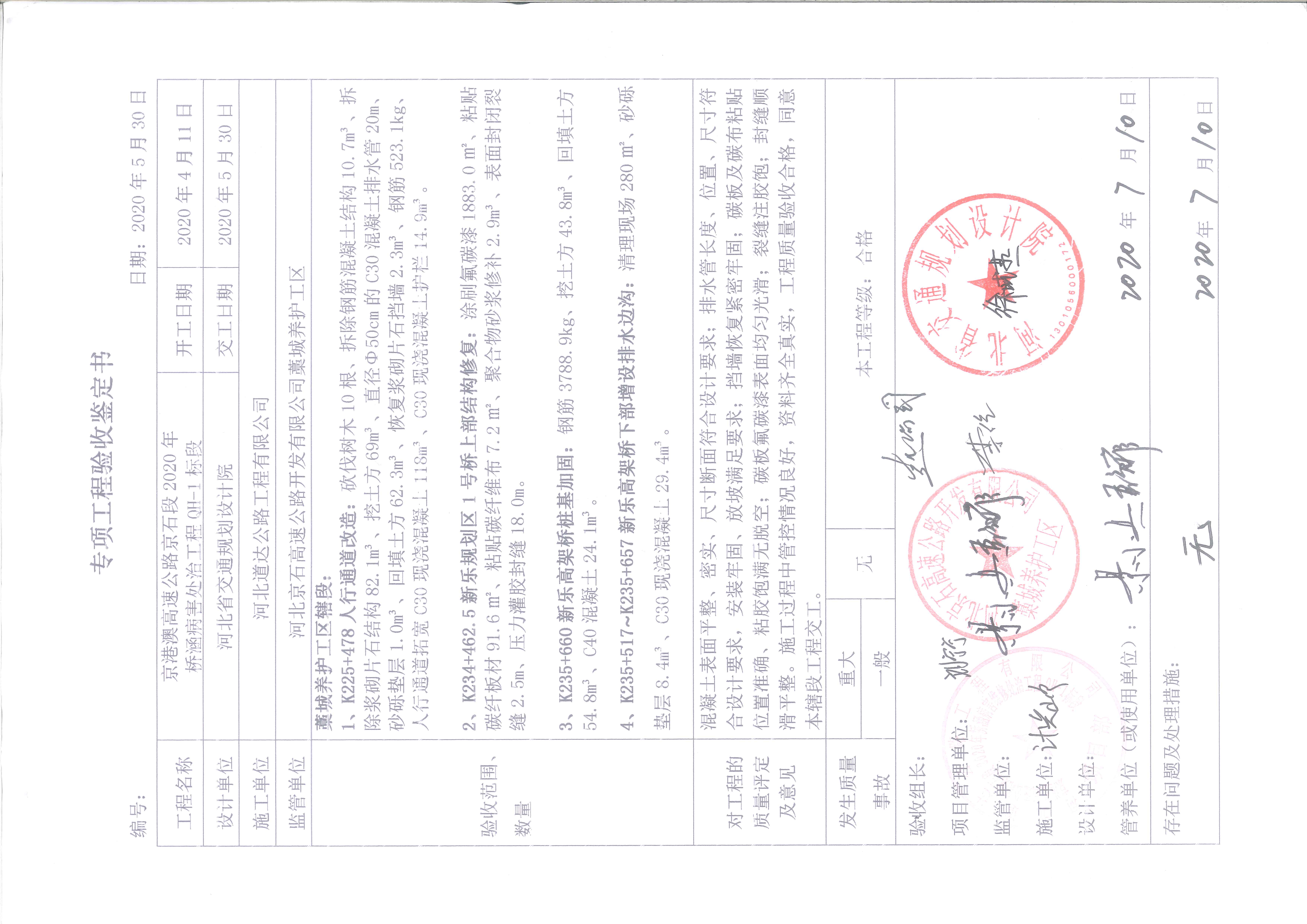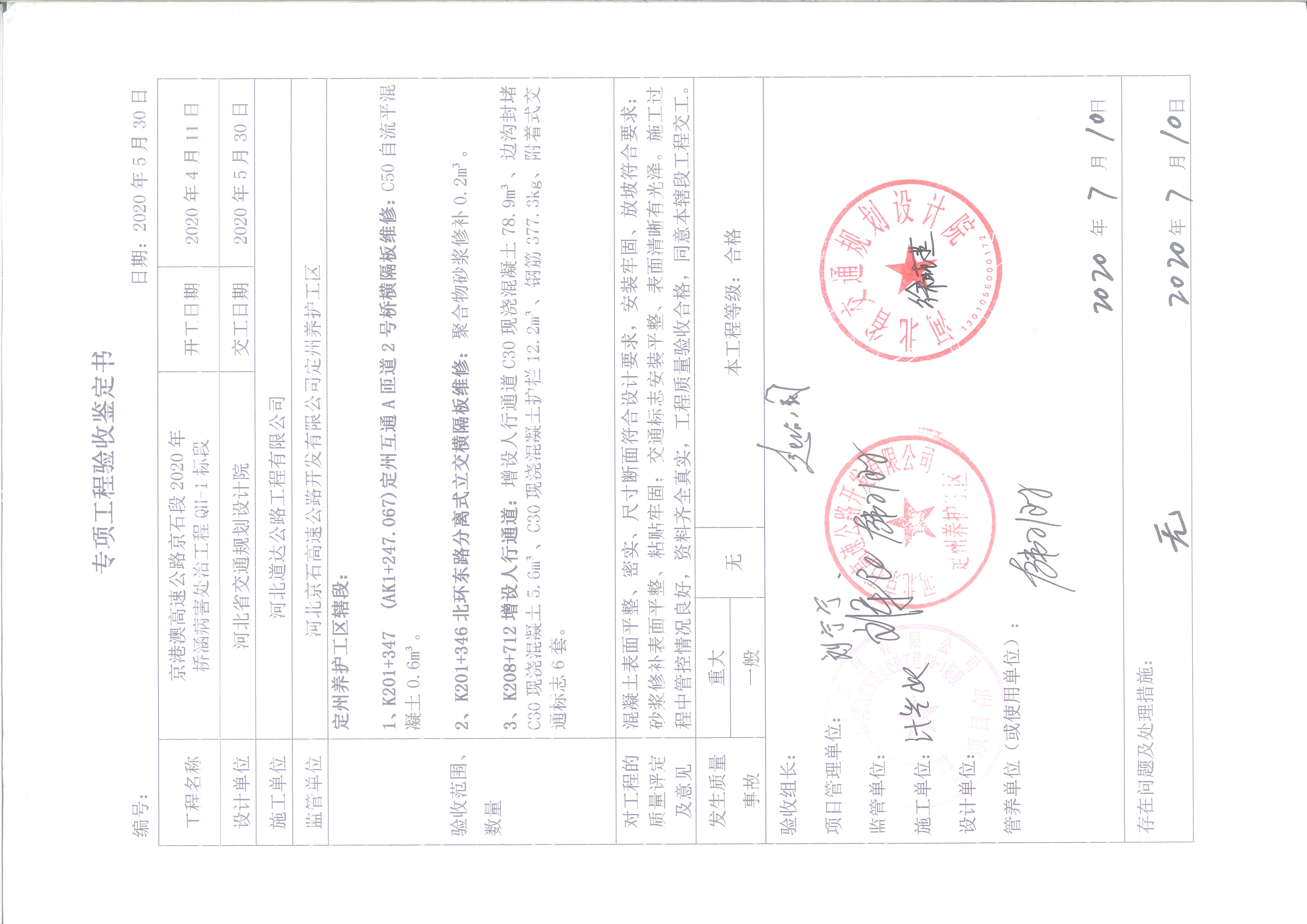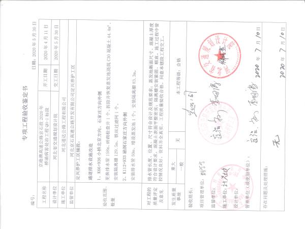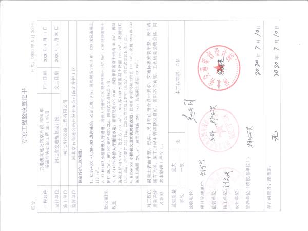 京港澳高速公路京石段2020年橋涵病害處治工程QH-1標(biāo)段驗收證書