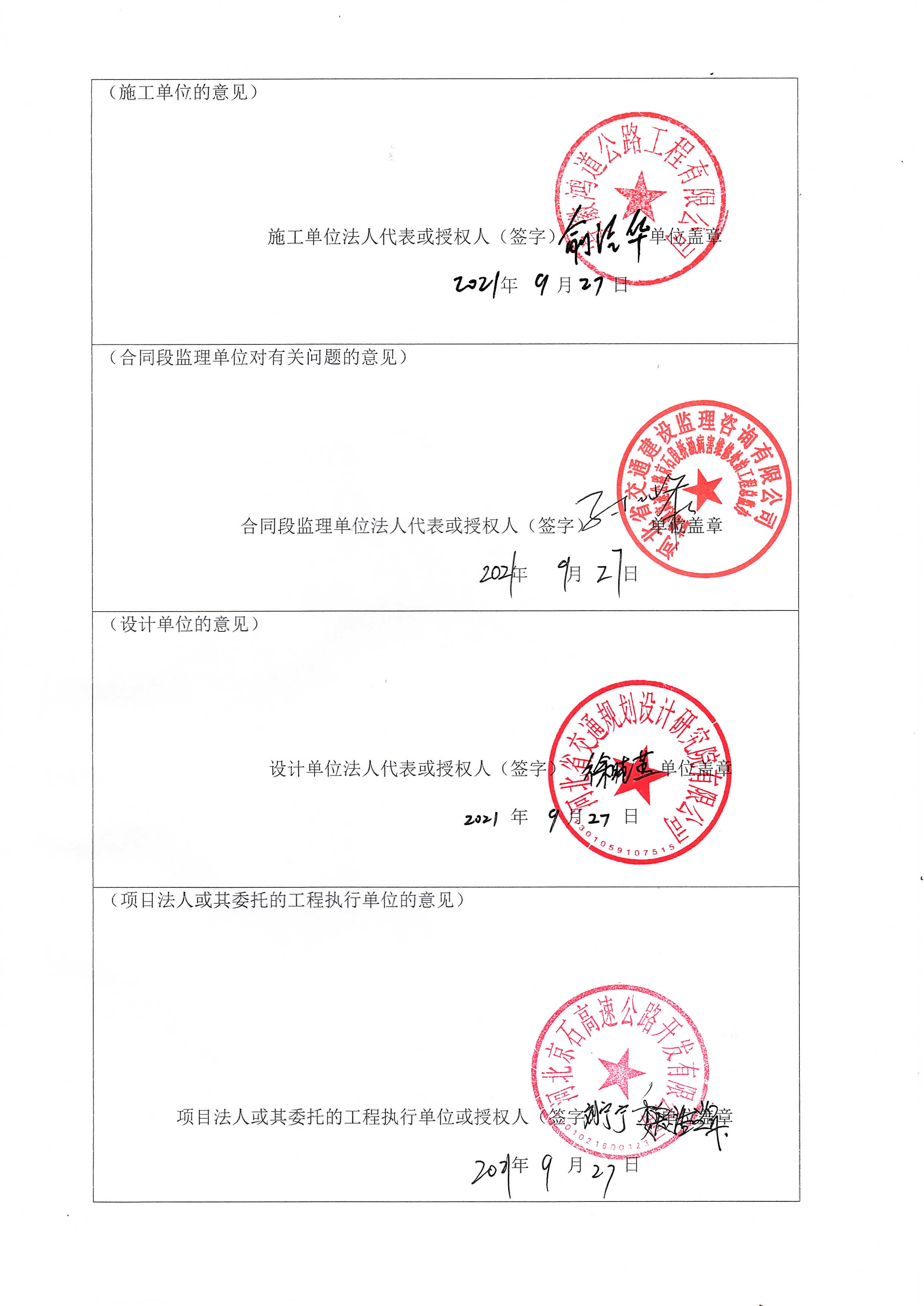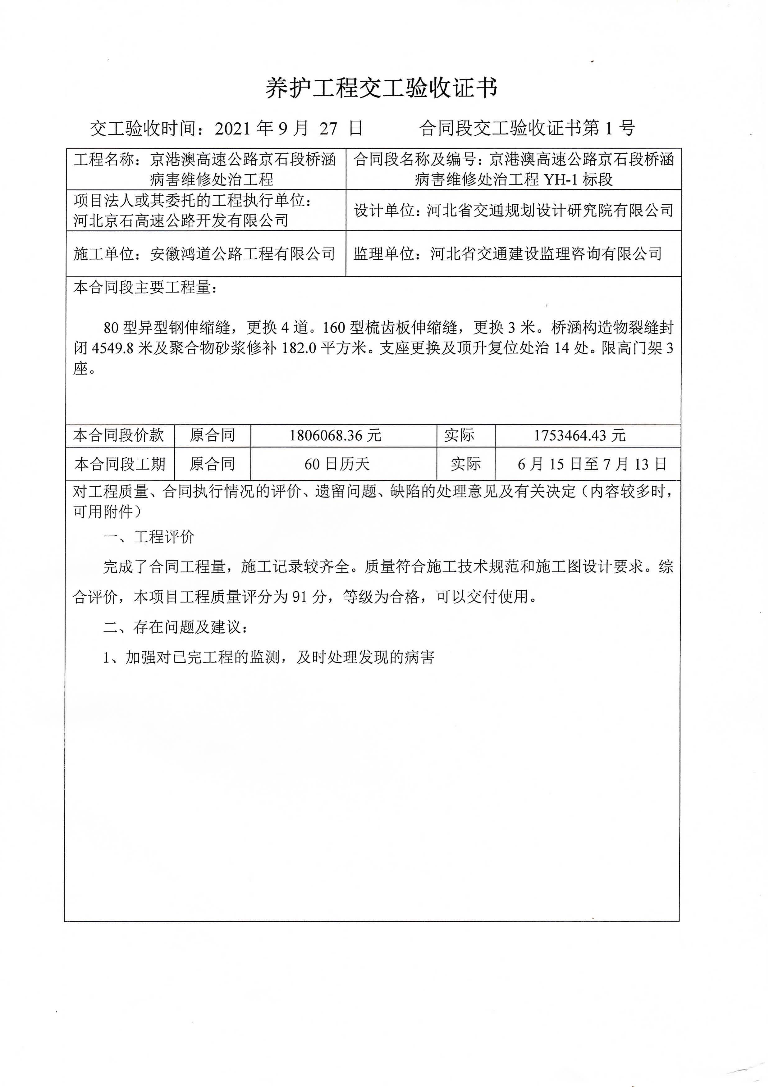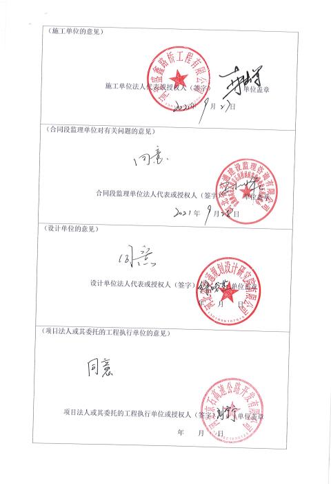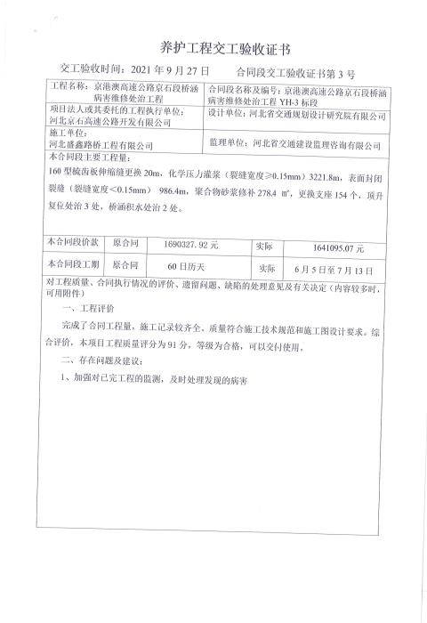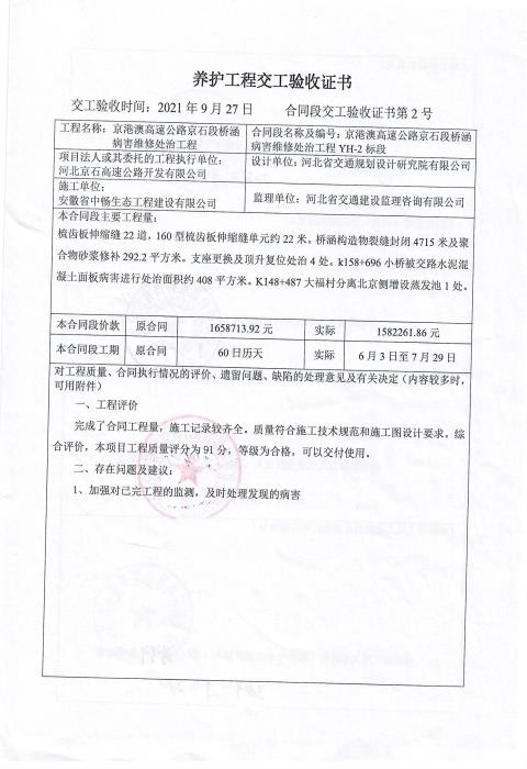 京港澳高速公路京石段橋涵病害維修處治工程驗收證書