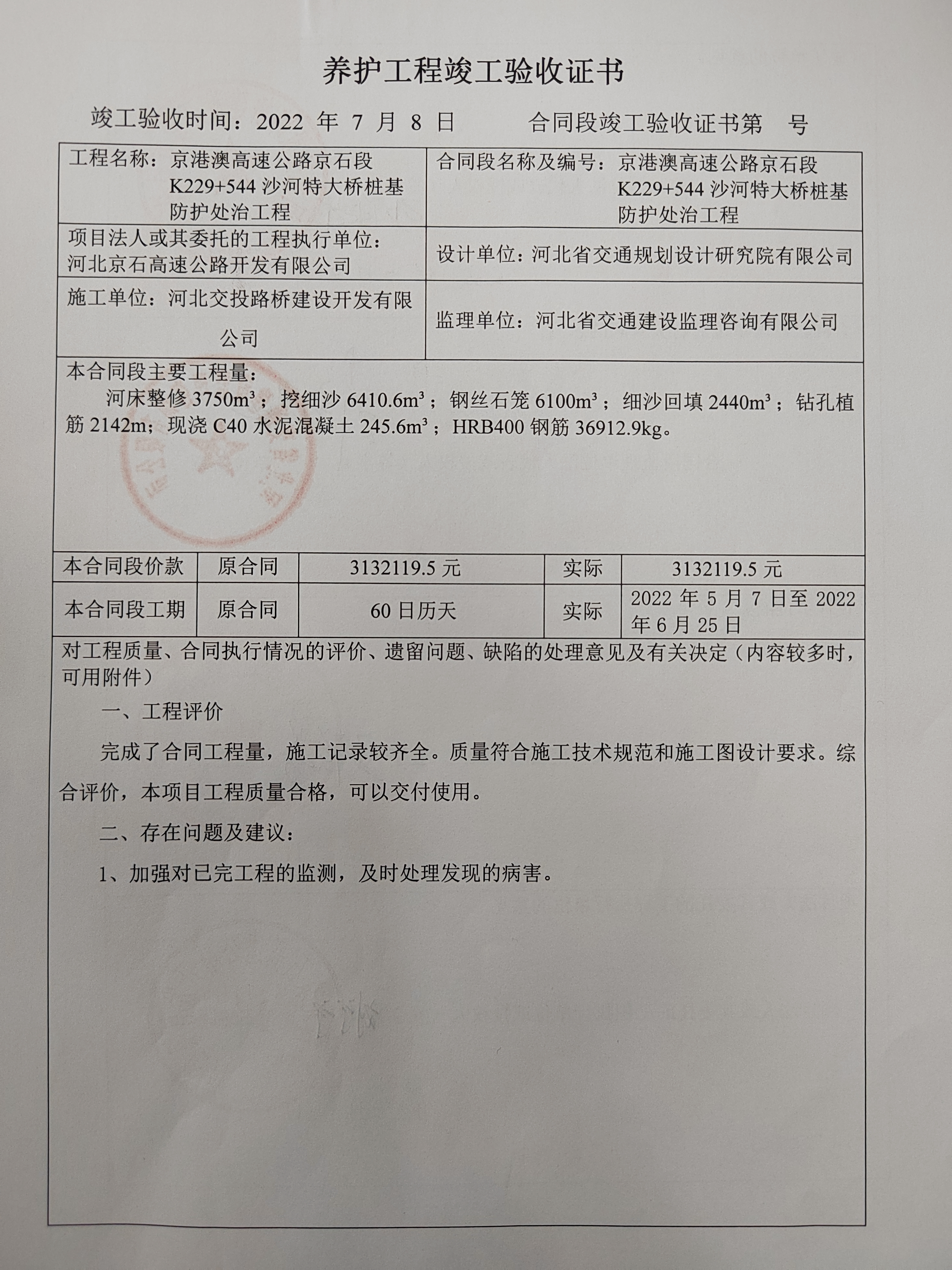 京港澳高速公路京石段沙河特大橋樁基防護處治工程驗收證書