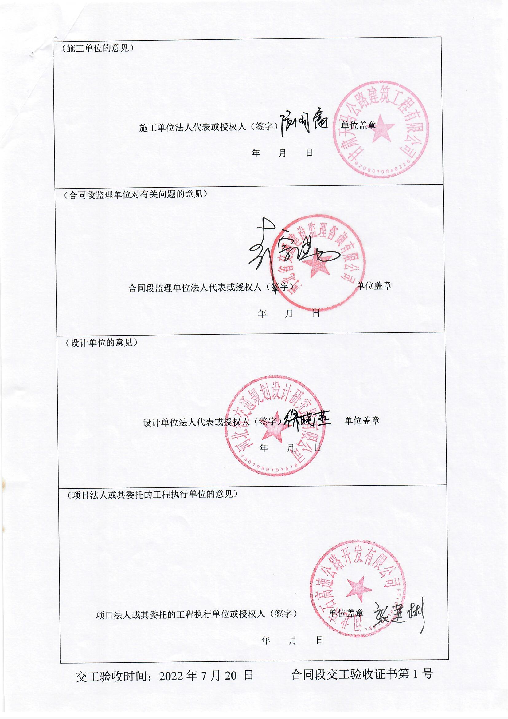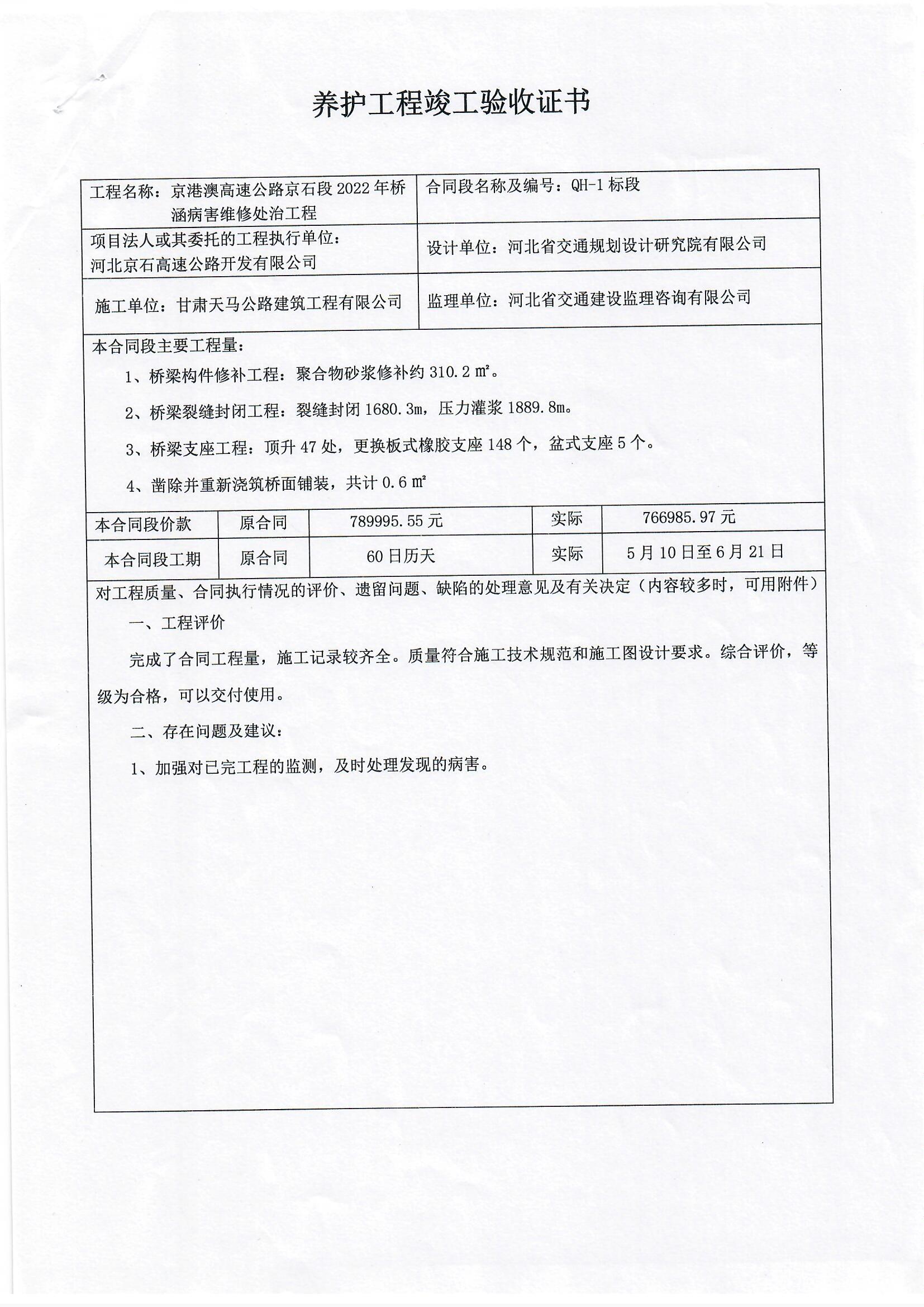 2022年橋涵病害維修處治工程QH-1標(biāo)段驗收證書