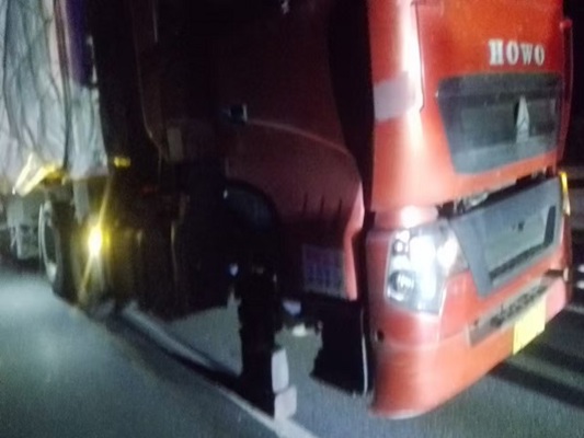 經(jīng)詢問司機(jī)得知,貨車右前輪突然掉落,導(dǎo)致車輛無法移動。事發(fā)突然,且處于夜間,大風(fēng)呼嘯,情況十分危險(xiǎn)。定州工區(qū)工作人員立即反應(yīng),第一時間在貨車后方規(guī)范設(shè)置交通警示標(biāo)志,巡查車開啟導(dǎo)向標(biāo)、高音警報(bào)器,避免過往車輛發(fā)生碰撞事故,引導(dǎo)車上人員轉(zhuǎn)移至護(hù)欄外安全地帶。同時,迅速撥打高速交警與救援電話,通報(bào)現(xiàn)場情況。智調(diào)中心及時利用可變情報(bào)板對后方來車予以提醒,避免造成事故。