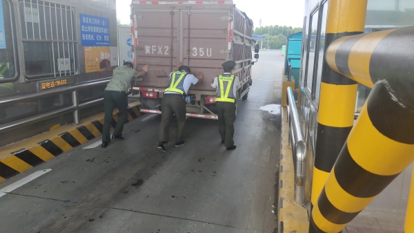 根據(jù)綠通車免費(fèi)政策,車輛需單獨(dú)稱重過磅,嚴(yán)禁硬拖通過。李根黨了解情況后,迅速拿起對講,尋呼綠通檢驗員李東洋和吳義挪,同時與副駕駛?cè)藛T溝通,一同幫忙推車。眾人齊心協(xié)力,喊著口號,車輛緩緩駛向磅臺。在大家的努力下,車輛成功駛過磅臺。經(jīng)計算噸位,該車符合綠通車免費(fèi)標(biāo)準(zhǔn)。隨后,眾人又一鼓作氣,將車推至驗貨區(qū)。此時,大家的臉上和身上早已浸滿汗水,衣衫也被汗水濕透,但沒人有絲毫怨言。