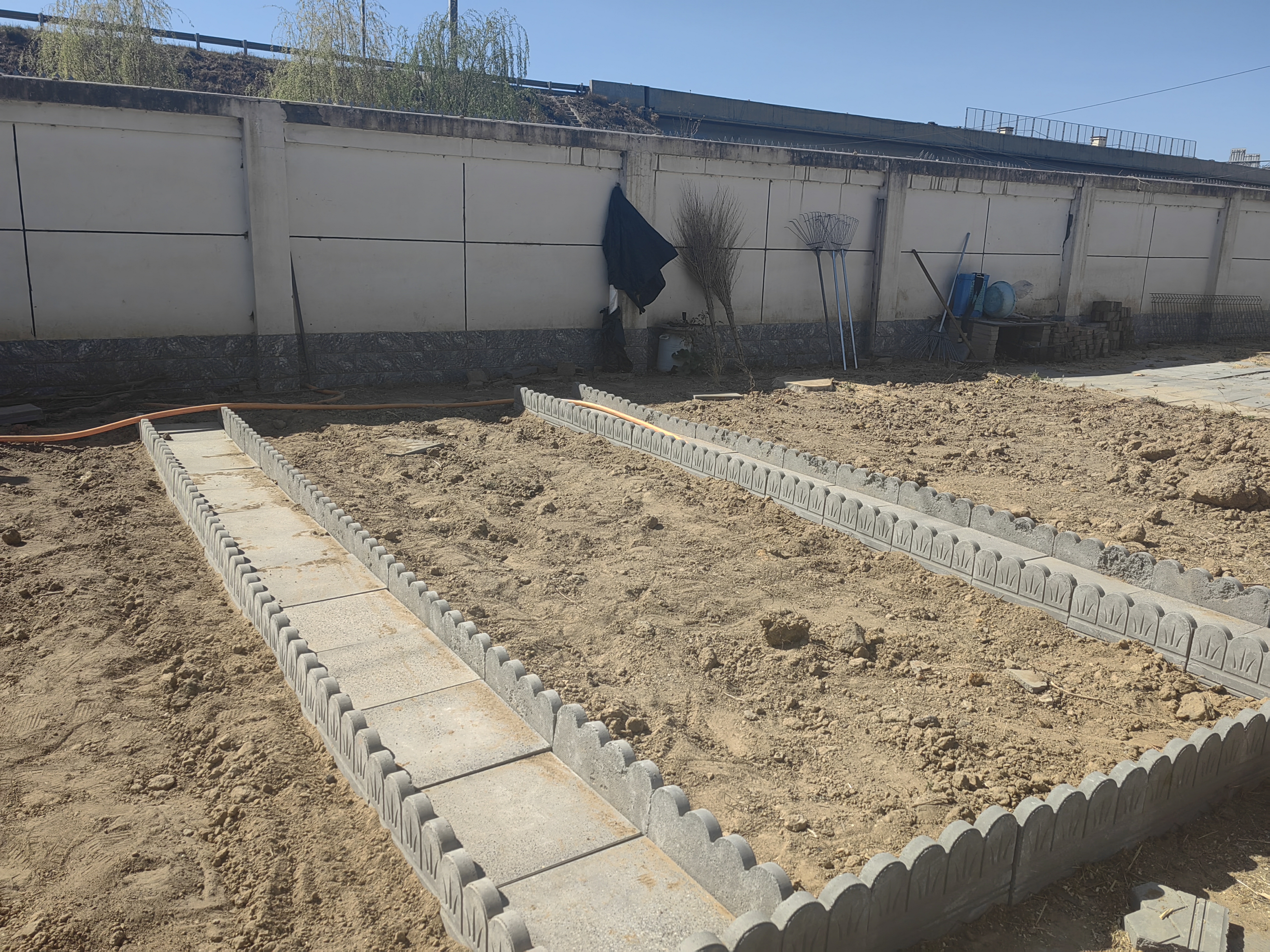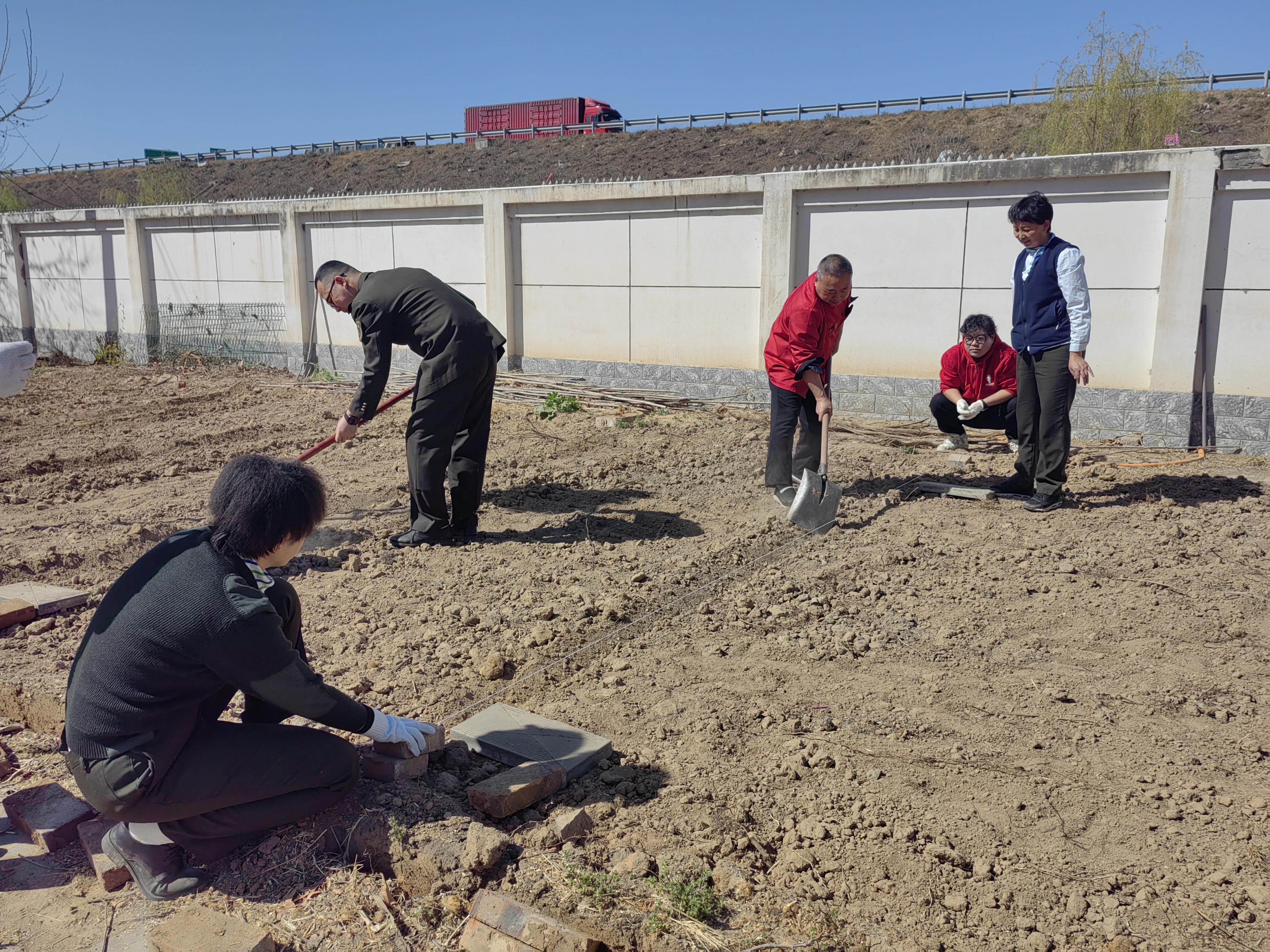在鋪磚環(huán)節(jié),大家集思廣益,雖然不是專業(yè)的,但是在這個網(wǎng)絡(luò)發(fā)達的時代,大家對照手機里的教學視頻,將每塊磚錯縫排列,既能防止雜草滋生,又形成自然的導(dǎo)水槽。站長劉淑芳帶著“徒弟們”用棉線拉出筆直的基準線,食堂“資深”的蘇師傅手持橡膠錘反復(fù)敲打校正,磚縫誤差嚴格控制在3毫米內(nèi)。新入職的昕瑤邊鋪磚邊贊嘆:“這手藝太牛了。”引得眾人哈哈大笑。大家干得熱火朝天,汗水浸透了衣服,也不知疲倦,仿佛閃念間看到了不久后菜園里豐收的場景。
